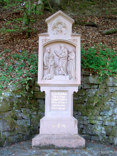 Restauriert 1981. Stationsbilder der sieben Schmerzen Mariens, geschaffen von Bildhauer J. Hess im 19 Jahrhundert, führen zu dieser einsamen Pilgerstätte. [2]