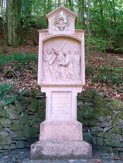 Restauriert 1981. Stationsbilder der sieben Schmerzen Mariens, geschaffen von Bildhauer J. Hess im 19 Jahrhundert, führen zu dieser einsamen Pilgerstätte. [2]