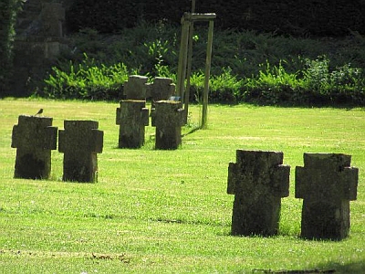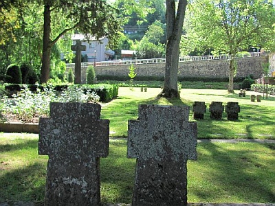 Auf dem Friedhof sind 830 deutsche Soldaten bestattet. Außerdem ruhen dort 68 ausländische Kriegsgefangene beziehungsweise Zwangsarbeiter (überwiegend Polen und Russen). Die Gräber sind durch keramische Namenssteine gekennzeichnet. lm Gräberfeld verstreut stehen Gruppenkreuze (Kameradenkreuze). [1]