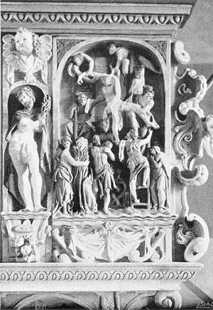 Die Rundbilder sind jeweils durch unterschiedliche Muster und Verzierungen eingefasst. Auf dem gewundenen Schriftband stehen die Worte aus dem Alten Testament: "Ihr werdet Wasser schöpfen mit Freude aus den Quellen des Heils".