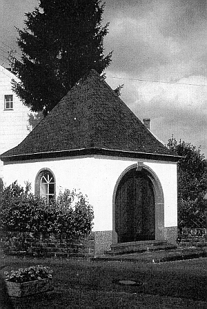 1949 entstand die quadratische Kapelle mit Pyramidendach. Ihr weites Eingangsportal, die beiden seitlichen Fenster und das Sandsteinrelief einer Kreuzigungsgruppe der Gebrüder Christof und Johann Mathony Seffern, im flachgedeckten Inneren schließen rundbogig. [1]