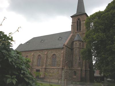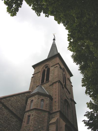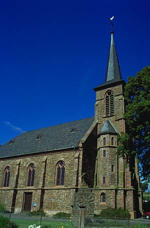 Neugotische dreischiffige Hallenkirche, Bruchsteinbau, 1898, Architekt Krekeler, Prüm; Ausstattung; Kriegerdenkmal 1914/18, bezeichnet 1924. [1]