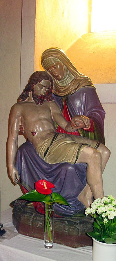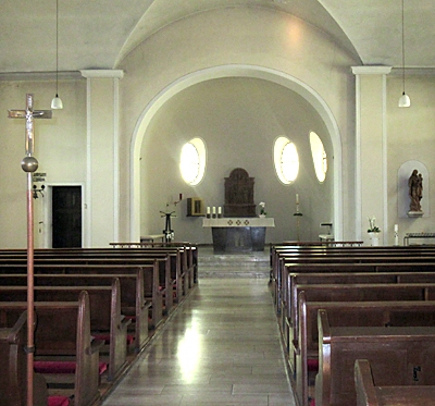 So entstand ein geräumiger, breitgelagerter Bau, der auch im Inneren weiträumig und einheitlich wirkt. Schlanke Eisenstürzen vermitteln vom tonnengewölbten Mittelschiff zu den flachgedeckten Seitenschiffen, vor dem Chorbogen kreuzt die Tonne des Mittelschiffes das Tonnengewölbe des Querschiffes, so daß quasi ein kreuzgratgewölbtes Vierungsjoch entsteht. An älterer Ausstattung haben sich in den längsovalen Apsisfenstern und den Fenstergruppen des Querschiffes Scheiben mit figürlichen Darstellungen erhalten, die stilistisch dem Neobarock nahe stehen, aber auch typisch expressionistische Details aus ihrer Entstehungszeit - den 1920erJahren - zeigen. Das Untergeschoß des Westturms besitzt ein Kreugzgratgewölbe auf Eckkonsolen und beherbergt eine Terrakottagruppe der Schmerzhaften Muttergottes. Die Kreuzwegstationen von etwa 1930 sind Holzeinlegearbeiten.