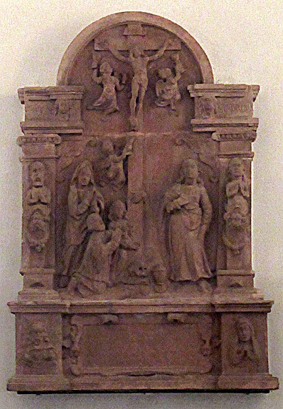 Das bedeutendste Kunstwerk der Mötscher Kirche ist jedoch ein Grabdenkmal, das heute über dem früheren Portal auf ihrer Südseite in die Außenwand eingebaut ist. Es besteht aus rotem Sandstein und zeigt eine Kreuzigungsszene. Seiner Inschrift nach wurde es von den Erben des Pfarrers Peter Kilborgh gestiftet. Seine Datierung 1600 befindet sich auf der unteren Kante des Rahmens. Die qualitätvolle Arbeit setzt die Kenntnis der gleichzeitigen Werke der Hans Rupprecht-Hoffmann-Schule aus Trier (Hauptmarktbrunnen, Domkanzel) voraus. [1]