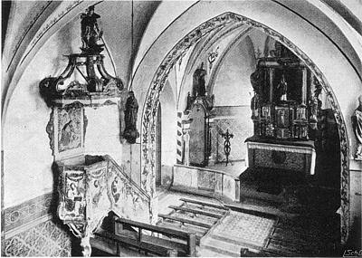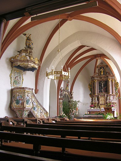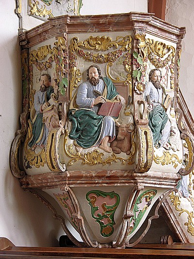 Die Kanzel, sehr reich und leicht gearbeitet, ist wie die Seitenaltäre in Rokokoformen d. 18. Jahrhundert gehalten. Den Fuß bildet eine Phantasiestütze aus Voluten, der sechseckige Stuhl, nach unten verdacht, ist mit ganzfigurigen Evangelistenbildern in Relief bedeckt, auf der Treppenwange der heilige Paulus und der heilige Johannes der Täufer. Die Umrahmung und Betonung der Kanten bildet Rokokowerk, auf dem geraden, seitlich von Rokokowerk begleiteten Wandbrett eine büßende heilige Magdalena, auf dem von Voluten bekrönten niedrigen Schalldeckel die Figur desMichael.