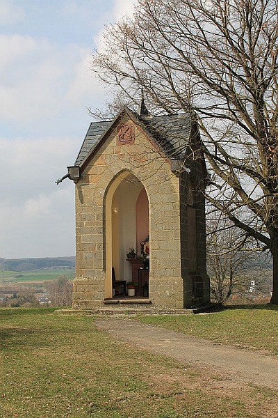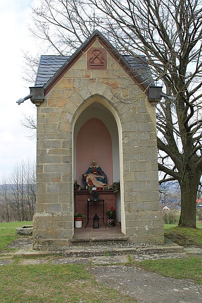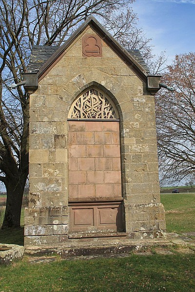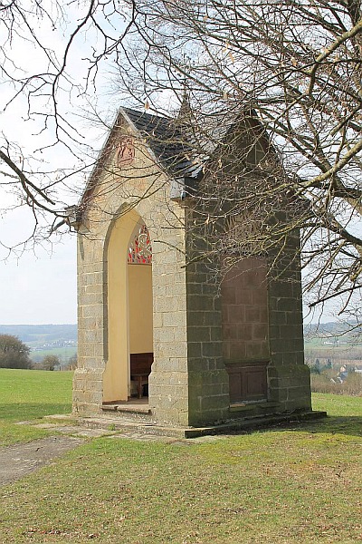 Hohe, spitzbogige Blendnischen auf den Längsseiten und eine entsprechende Öffnung auf der Vorderseite charakterisieren die Votivkapelle aus gelbem und rotem Sandstein. Alle vier Außenwände sind übergiebelt, im kreuzgratgewölbten Inneren hat auf einer Altarmensa mit Blendmaßwerk eine Pietà Platz gefunden. In die Rückwand ist der 1688 datierte Schaft eines barocken Wegekreuzes eingebaut. [2]