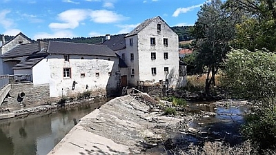 An der Prümbrücke links des Flusses gruppiert sich eine größtenteils im Laufe des 19. Jahrhunderts entstandene Mühle mit Landwirtschaft zu vier Seiten eines Hofs. Die südlichen Gebäude - Stall mit rundbogigem Eingang, Wohnhaus und Mühle - bilden den ältesten Teil. Das Wohnhaus ist auf einem Pilasterportal 1806 datiert. Die Tür zur Mühle nennt Anna Maria Etscheid als Erbauer und 1818 als Baujahr. Der Stall nennt auf seinem elliptischem Fensterchen das Baujahr 1862 und den Bauherrn Philipp Etscheid. Der prümseitige Trakt, der bis auf die Brennerei zum Hof hin offen ist, sowie die Hofdurchfahrt entstanden wenig später. Das viergeschossige Turbinenhaus im Westen stammt von 1953. [1]