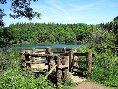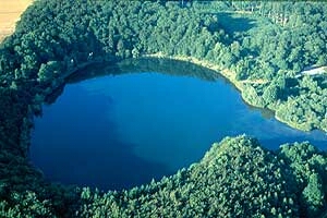Wasserfläche 6,8 Hektar, Tiefe 21 Meter, Durchmesser 325 Meter. Dieses Maar hat sowohl einen Zu- als auch einen Abfluss [Letztes Bild]. Naturschutzgebiet (Holzmaar und Umgebung).