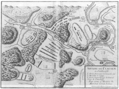 Jedenfalls trafen 30.000 bis 35.000 deutsche Soldaten am 20. Oktober 1735 in Richtung Trier marschierend auf die aus Trier kommenden 25.000 Mann zählenden französischen Truppen. Am linken Ufer der Salm zwischen Esch und Rivenich hatten die deutschen Truppen Stellung genommen, die Reserven standen in dem Tälchen, das von Esch nach Klausen hinaufführt sowie auf dem Berg östlich von Rivenich. Weitere Reserven befanden sich zwischen Sehlem und Pohlbach sowie auf der Höhe östlich von Salmrohr. Die Franzosen standen auf der rechten Salmseite zwischen Rivenich und Hetzerath. Überlieferungen zufolge hatten sie die Wiesen durch Aufstauen der Salm unter Wasser gesetzt, um den deutschen Truppen den Vormarsch zu erschweren.305 Gegen 16 Uhr gab der deutsche Kommandant Graf von Seckendorf seinem linken Flügel den Befehl zum Angriff auf die von den Franzosen besetzte Rivenicher Brücke. Die Franzosen hingegen rückten mit zwei Linien gegen das Korps de Bataille (Zentrum), dem Dorf Esch gegenüber, an. Sie wurden aber auch da aus etlichen Kanonen abgehalten.[...]Sodann bekam der Generalfeldmarschallleutnant Baron v. Diemar die Order, mit 6 Grenadierkompagnien die Franzosen beim dem Dorfe Rivenich wiederum zu vertreiben.