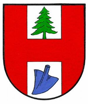 In Silber ein rechter und ein linker roter Flankenbalken, oben in Silber eine grüne Fichte, unten eine blaue Pflugschar.