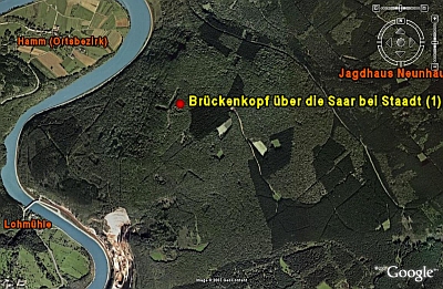 senkrechte Felsen, die fast bis an die Saar herabreichten. Der Uferstreifen war durch feindliche Stellungen versperrt. Nach einer kurzen Erkundung kam Leutnant Eckstrom zum Bunker zurück, als gerade von zwei Deutschen Handgranaten geworfen wurden.