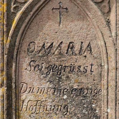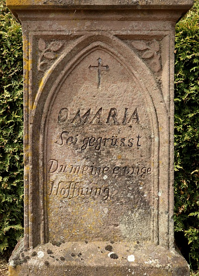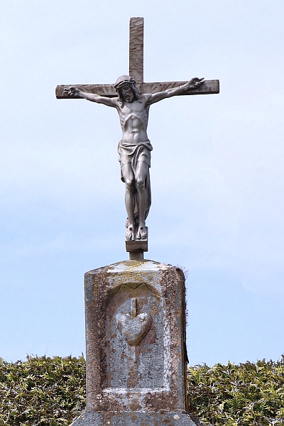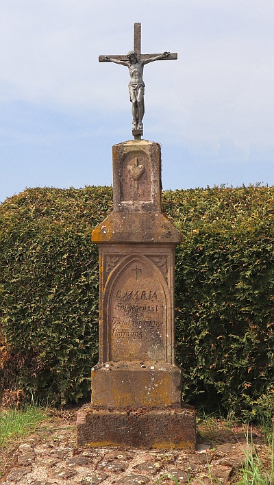 An der Abzweigung des Weges nach Merzkirchen von der Kreisstraße 121. Gusseisernes Kruzifix auf zweiteiligem Sandsteinsockel. Der dachförmig zulaufende Unterbau ist als Inschrifttafel in neugotischer Blende gearbeitet, die Inschrift unleserlich. Darauf der Kreuzsockel, ein geschlossener Nischenaufsatz mit dem Relief eines flammenden Herzens. Das um 1860 errichtete Kreuz steht am Weg zur Pfarrkirche. [1]
