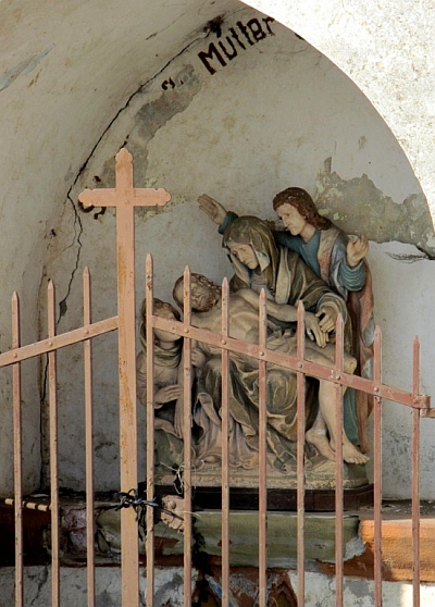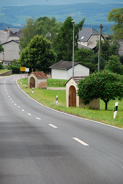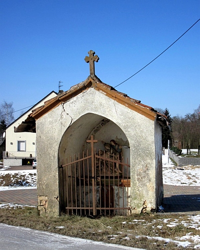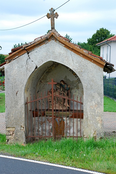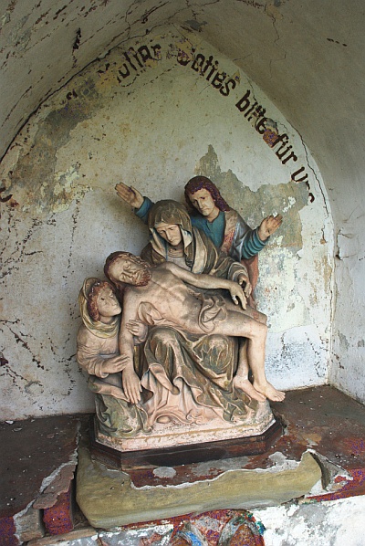 Die westliche der dicht hintereinander stehenden Kapellen ist ein gerade geschlossener, in der ganzen Breite geöffneter, tonnengewölbter Putzbau unter Ziegeldach. Darin auf gemauertem Altar (Inschriftplatte bezeichnet MA Rörsch und Familie 1874) eine Pietà vom Klausener Typ. [1]