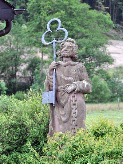 In seine Giebelseite ist ein bis auf das jüngere Abschlußkreuz und die bestoßene Konsole ein gut erhaltenes Schaftkreuz des 18. Jahrhunderts eingelassen. [1]