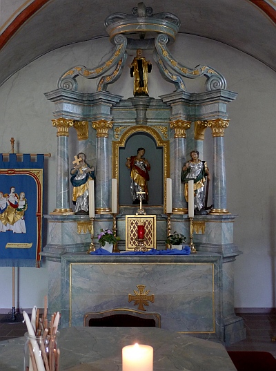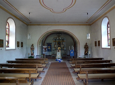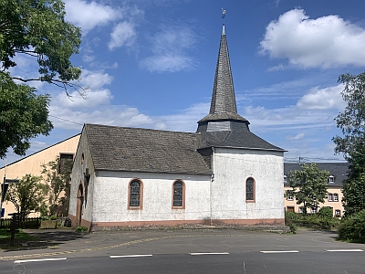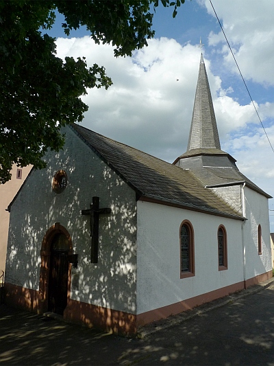 Am nördlichen Ortseingang gelegener zweiachsiger Saalbau des frühen 18. Jahrhunderts mit niedrigem mittelalterlichem Chorturm. Das Äußere ganz schlicht mit werksteingefassten Rundbogenfenstern, rundbogigem Eingang mit Scheitel- und Kämpfersteinen und einem Okulus. Der Turm mit winzigem rechteckigem Schalloch und achtseitigem, stark eingezogenem und direkt oberhalb der Einziehung gestuftem Spitzhelm. [1]