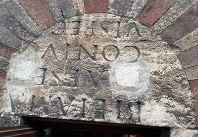 Als Türsturz über diesem Zugang ist ein antikes Inschriftenfragment eines römischen Grabsteins aus dem 2. Jahrhundert n. Chr. verbaut, das erst bei Abrissarbeiten des vormals links am Frankenturm angebauten Wohnhauses im Jahr 1956 wiederentdeckt wurde.