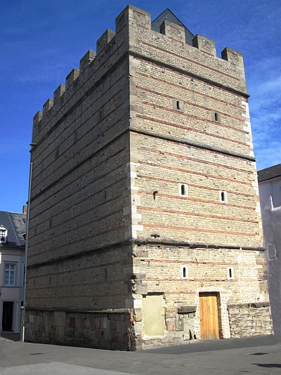> Geht der Besucher vom Hauptmarkt aus an der Steipe und dem Roten Haus vorbei in die Dietrichstraße, gelangt er nach etwa 5zum Frankenturm . Dieser entstand im 11. Jahrhundert in einer der römischen Zeit typischen Bauweise, nämlich im Wechsel von Bruchstein- und Ziegelschichten.
