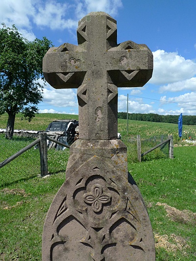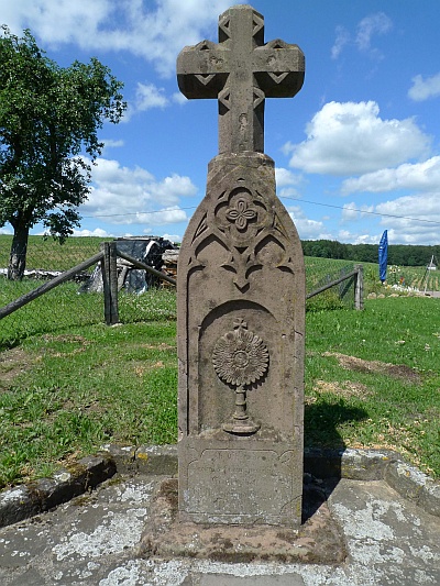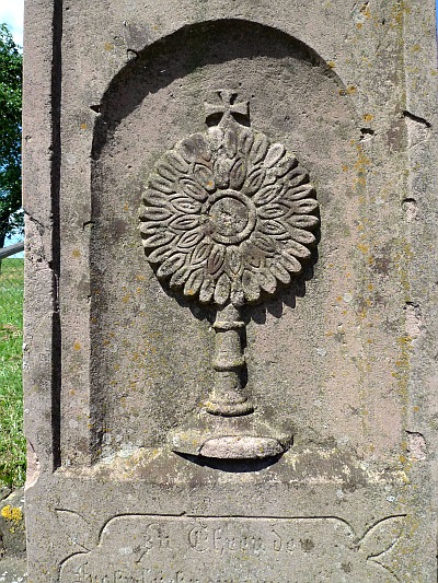 Der hohe Sockel schließt spitzbogig und erscheint wegen des Blendmaßwerks im Bogenfeld als Abbild eines Kirchenfensters. In der Fensteröffnung zeigt eine flache Nische das Reliefbild einer Monstranz, darunter die glatte Inschriftplatte. Abschlußkreuz mit achtkantigen genasten Balken. [1]