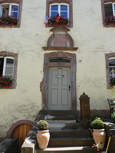 Vor ein paar Wochen habe ich dieses Haus erworben und werde in Kürze mit der Restaurierung beginnen. Nach eingehender Untersuchung der Inschrift im Wappen über der Tür sind wir davon überzeugt, dass das Haus aus dem Jahre 1746 stammt und nicht erst aus den 60er Jahren des 18. Jahrhunderts. [2]
