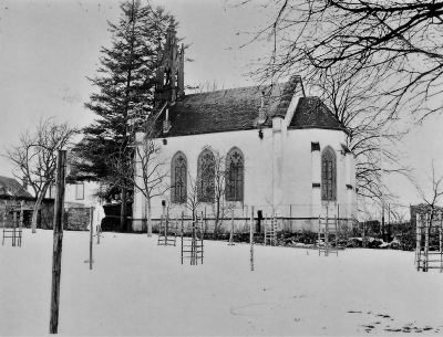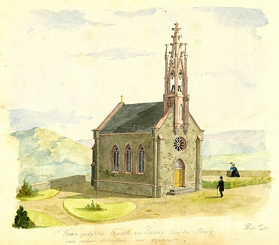 Evangelischen Kirche Daun auf dem Burgberg, die 1863 erbaut, 1944 durch Bomben beschädigt und 1949 in erweiterter Form wieder aufgebaut wurde. Die 1863 erbaute Kapelle wurde vom Königlichen Oberförster Hermann von Witzleben in einem Aquarell malerisch festgehalten. Er vermerkte handschriftlich " Evangelische Kapelle auf dem Burgberg von meiner Wohnstube aus gesehen. 15.12.1863" Der Königliche Oberförster hatte seinen Dienst- und Wohnsitz im Kurtrierischen Amtshaus.