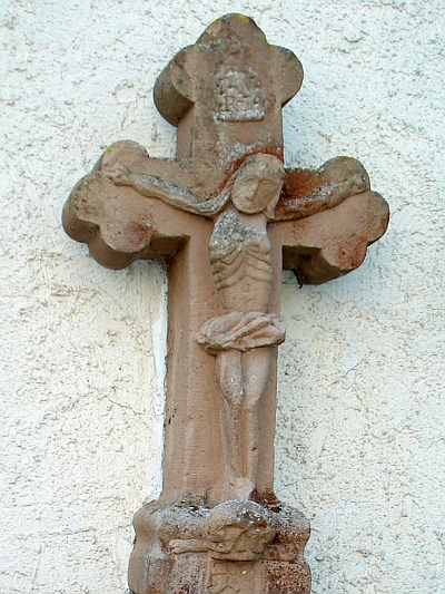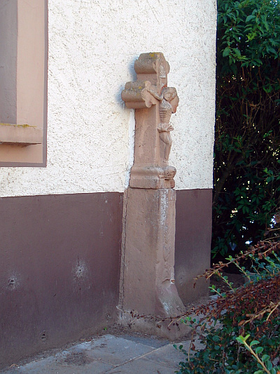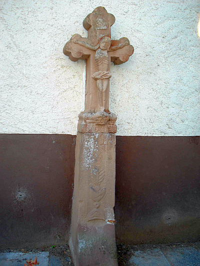 Schaftkreuz von 1726 (Inschrift), an die östliche Giebelwand des veränderten Hauses angelehnt. Dem unten stark nach vorn gebauchten und nach oben verjüngten Schaft fehlen Sockel und Kapitell, auf der Vorderseite in flachem Relief ein Kelch mit verballhornter Hostie im Strahlenkranz. Großes Abschlußkreuz in Form eines Kleeblattkreuzes, der Korpus in anspruchsloser Steinmetzarbeit. Das ganze Kreuz offenbar nach einem zwei Jahre älteren Vorbild in Sankt Thomas entstanden (siehe dort, Hauptstraße 22). [1]