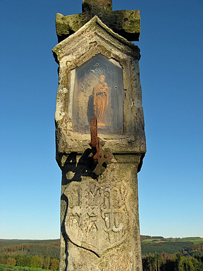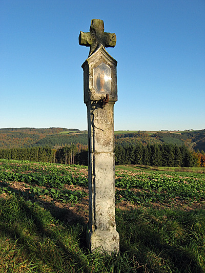 An der Straße südlich des Weilers Bruderholz: stark verwittertes, schlankes Nischenkreuz, in den Proportionen noch den Kreuzen des 16. Jahrhunderts ähnlich, während die Nische mit dem Abschlußkreuz eher dem Kyllburger Typ entspricht. Auf dem Schaft nur ein Schild mit dem Wappen der Adelsfamilie von Lontzen und einem Bischofs- oder Abtstab, möglicherweise als Wappen der Anna von Lontzen, Äbtissin des Klosters Sankt Thomas, zu deuten, die 1637 mit mehreren anderen Nonnen an der Pest starb. [1]