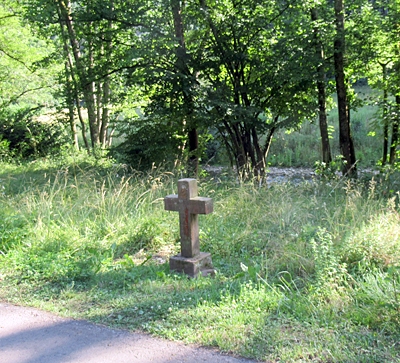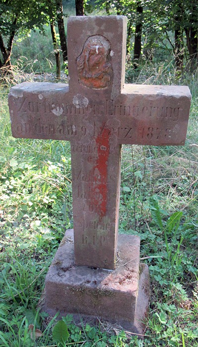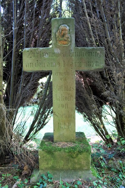 Im Kylltal südlich der Speichermühle. Kleines Balkenkreuz, ZUR FROMMEN ERINNERUNG AN DEN AM 9. MÄRZ 1878 VERUNGLÜCKTEN MATHIAS JAKOBI VON SPEICHER errichtet. Oberhalb des Querbalkens stark beschädigte Reliefbüste. [1]