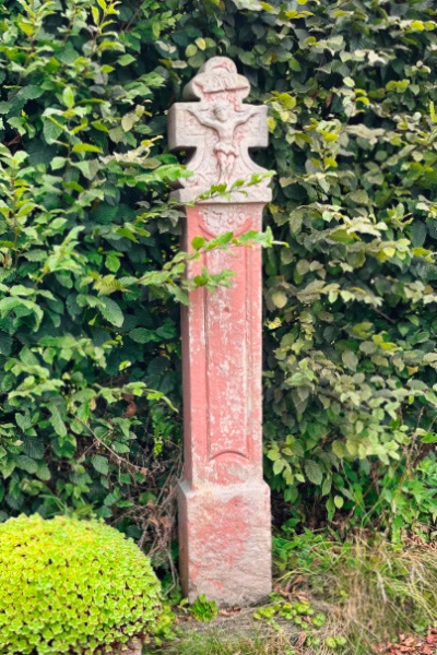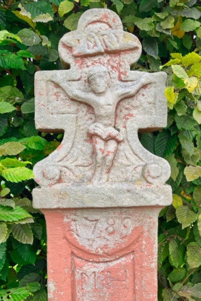 Dieses Schaftkreuz misst 1,90 m und der vierkantige Schaftfuß weist keine Verzierungen oder Schriften auf. Im oberen Schaft ist die Jahreszahl 1789 eingelassen. Außerdem hat der Schaft zwei schmale Zierlinien und ein Monogramm. „MH“ ist wohl ein Hinweis auf den Stifter. Den Abschluss bildet ein 35 cm hohes Kreuz mit eingemeißelt flachem Christuskorpus und darüber die Inschrift I. N. R. I. Zwei Blattornamente rahmen den Korpus.
