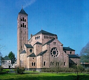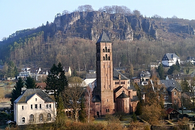 Erbaut 1911-13. Hundertstes und letztes Projekt des Berliner Evangelischen Kirchenbauvereins. Monumentaler Höhepunkt des Historismus in der Eifel. Im Vorstand: Freiherr von Mirbach. (s. Wiesbaum-Mirbach).