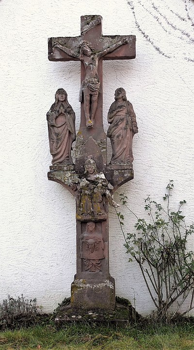 Das stattliche Wegekreuz stand bei der abgebrochenen Kapelle an der Alten Brücke. Es weist noch spätgotische Anklänge auf und ist oberhalb einer nicht aufzulösenden Inschrift auf 1587 datiert.
