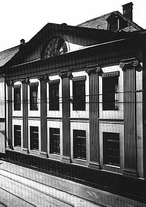 Die Ausgestaltung der Fassade mit Pilastern, Gebälk und Dreiecksgiebel verleiht ihr den Charakter einer flächig vorgeblendeten Tempelfront. Ein Vorbild für dieses Haus könnte die 1824-26 von Karl Theodor Ottmer erbaute Singakademie zu Berlin gewesen sein, ein tempelähnlicher Bau mit pilastergegliederter Giebelfront.