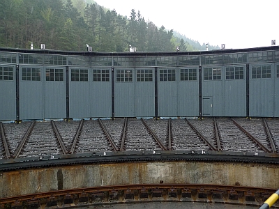 Rundlokschuppen, Magazin-, Verwaltungs- und Werkstattgebäude, 1928–30, nach Kriegszerstörungen 1949/50 wiederaufgebaut. [2]