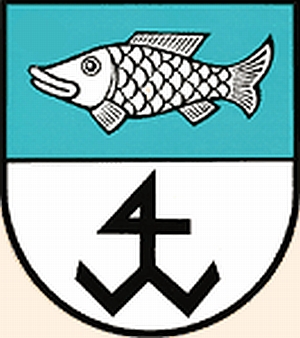Von Blau über Silber geteilt, oben ein silberner Fisch, unten ein schwarzes Steinmetzzeichen in Form eines Vierkopfschaftes mit Doppelsturzsparrenfußschaft.