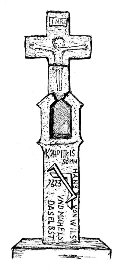 Ein weiteres Kreuz aus der Zeit des beginnenden 17. Jahrhunderts steht etwa 500 Meter von der Abzweigung der Kyllburger Straße von der Bundesstraße; an der Wegekreuzung, dort, wo die Straße vom Weg Orsfeld - Wilsecker überquert wird. Das Nischenkreuz muß bereits mehrfach beschädigt worden sein. Es steht mit dem Schaft tief im Boden und läßt nur mehr den oberen Teil der Inschrift erkennen: