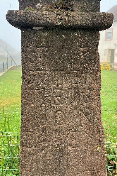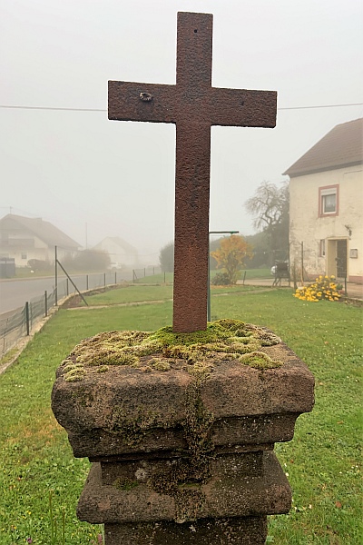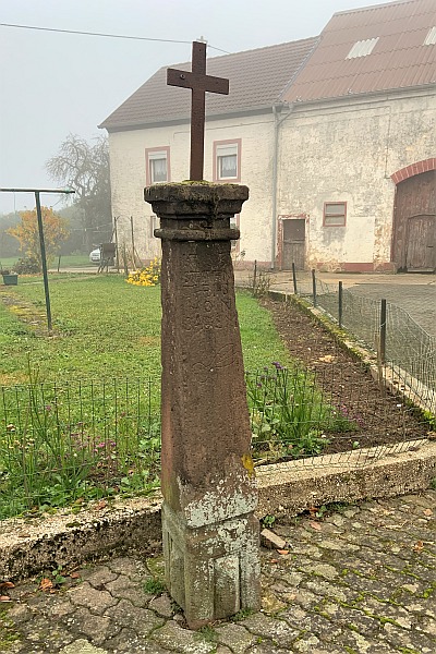 Schaftkreuz von 1703, ganz ähnlich dem an der Dudeldorfer Straße, hier jedoch auch das toskanische Kapitell erhalten. Auf der Schaftvorderseite unter dem Namen STIREN THEISS VON BADEM eine Wollschere eingeritzt. Neues Abschlußkreuz aus Eisen. [1]