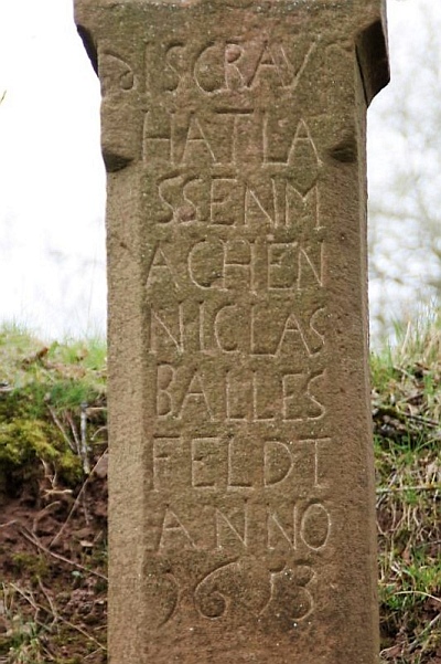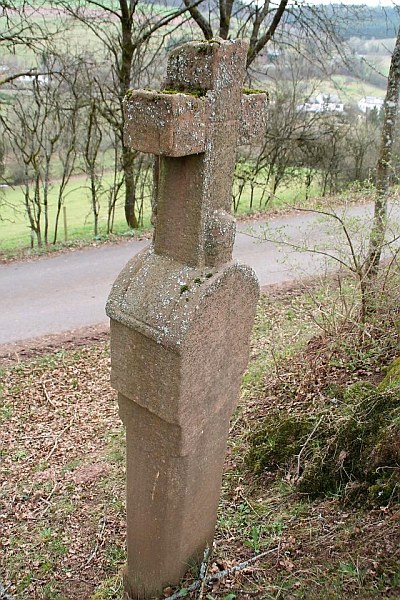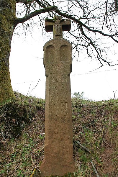 An der Straße von Burbach nach Balesfeld, nahe der Gemarkungsgrenze: Nischenkreuz, 1658 durch NICLAS BALLESFELDT (Inschrift) errichtet. [...] Stark verwittertes Abschlußkreuz. [...] Keinen historischen Bezug zum Ort Burbach. [1]
