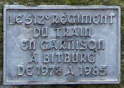 Ein Gedenkstein an die französische Garnison befindet sich im Waisenhauspark in Bitburg. Der Stein erinnert an das 16.512° Regiment du Train, welches von 1978 bis 1985 in der Kaserne in der Mötscher Straße stationiert war.