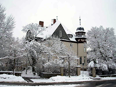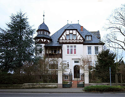 Prächtige freistehende Villa an der Ecke zur Koblenzer Straße, 1902/03 nach Plänen des Bauinspektors Fülles durch die Brauereibesitzerswitwe Griebler für ihren Schwiegersohn, den Medizinalrat und Kreisarzt Dr. Franz Überholz, meist in Formen der Renaissance deutscher Prägung in prominenter Lage am Stadteingang errichtet. Der zweigeschossige Kernbau mit steilem Walmdach ist vielfach aufgelöst und durch malerische Details wie Fachwerk, Loggia, Eckturm oder Erker asymmetrisch belebt. Trotz Modernisierung im Treppenhaus Jugendstilfliesen bemerkenswert. Vorgelagert ist ein parkähnlicher Garten mit der ursprünglichen Umzäunung. Das Anwesen ist Teil einer Denkmalzone. [1]