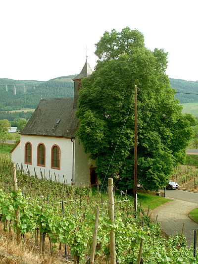 In die Weinbergslandschaft eingebetteter, geosteter kleiner Saalbau am östlichen Ortsrand.