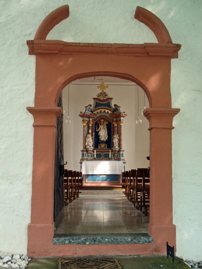 Die im 17. Jahrhundert errichtete Kirche wurde im 18. Jahrhundert erneuert. Auf das 17. Jahrhundert weist das steil geneigte Dach und ein straßenseitig wiederverwendetes rundbogiges Portal. Das korbbogige Portal mit rechteckiger Einfassung und segmentbogigen Gesimsstücken sowie mit originalem aufgedoppeltem, barockem Türblatt. Das Innere mit Voutendecke und 1950 erneuerten Fenstern (Kaschenbach, Trier). Seltenes spätgotisches Kruzifix, Hölzerner Säulenaltar des Rokoko mit mittlerer Figurennische; die Figuren Muttergottes, Evangelist Johannes und Nikolaus geraubt. Die Ausstattung ansonsten modern. [1]