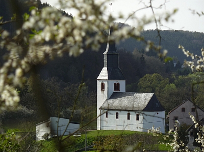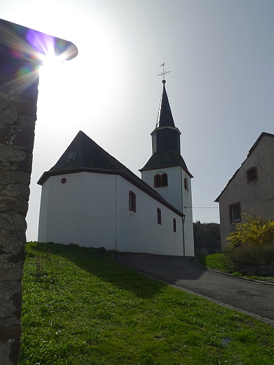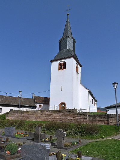 Saalbau, 18. Jahrhundert, Turm, teilweise romanisch, obere Teile von 1862; Schaftkreuz, Sandstein, bezeichnet 1846; etwa 15 Grabkreuze, 17. bis 19. Jahrhundert. [1]