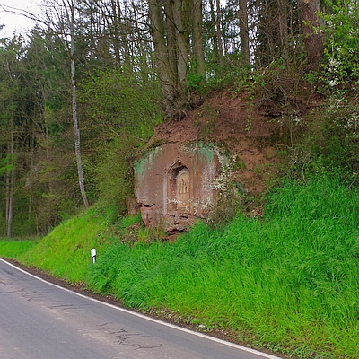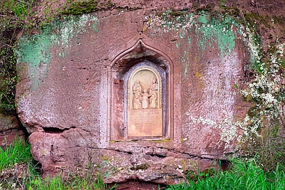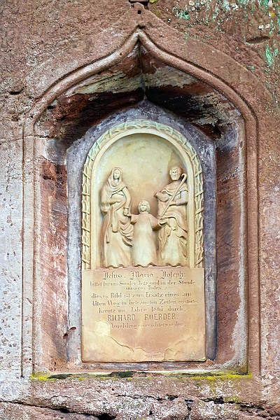In die senkrechte Felswand wurde eine Kielbogennische gehauen, an deren Rückwand sich eine Reliefplatte mit einer Darstellung der heiligen Familie befindet. Aufgrund der etwas unbeholfen anmutenden Bearbeitung der Nische, liegt die Vermutung nahe, dass die Nische älter übernommen wurde oder der Errichter sie selbst erstellt hat. [1]