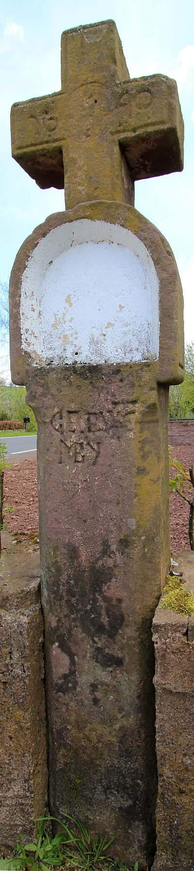 Das gut erhaltene, aus einem Stück rotem Sandstein gearbeitete Wegekreuz besteht aus einem Schaft mit zweizeiliger, jetzt unleserlicher Inschrift, einer flachen Rundbogenische und einem Abschlußkreuz, das auf dem Balken 1640 datiert ist. [1]