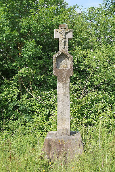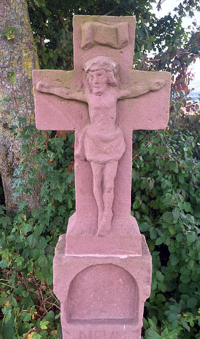 Das Kreuz aus dem Jahr 1653 an dieser Stelle erinnert an das frühere Ewen. Die Inschrift bedeutet: Neumanns Klaus und seine Ehefrau Catharina haben dieses Kreuz zur Ehre Gottes errichten lassen - Anno 1653