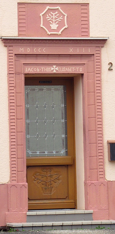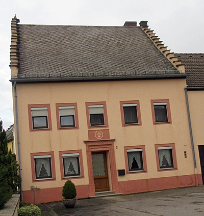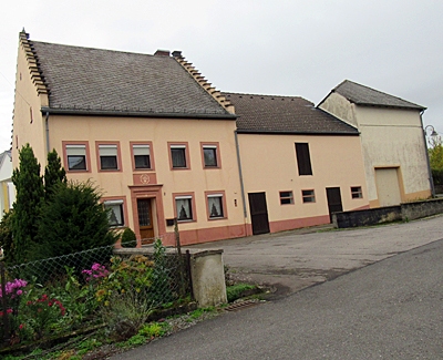 Das traufständige Wohnhaus trägt zwei Treppengiebel und gehört damit zu den letzten Beispielen dieses einst im Bitburger Land verbreiteten Typs. Aufgrund der Portalinschrift ist es auf 1813 zu datieren und als Erbauer Jacob und Elisabeth Theis zu benennen. Die Supraporte trägt das Relief eines Bäumchens. [1]