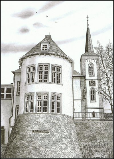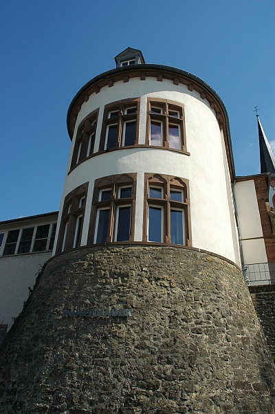 Die Westseite des Bitburger Pfarrhauses wird von dem römischen Turm Nr. "E" dominiert. Teile der römischen Stadtmauer verbinden die Türme "E" und "F" beim Rathaus. [2]