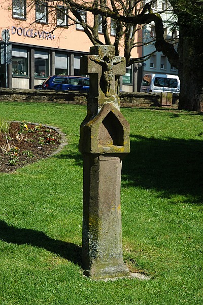 Das 1957 von der Nimsbrücke hierher versetzte spätgotische Nischenkreuz aus roten Sandstein hat einen breiten kurzen Schaft, dessen Kanten abgefast sind und endet in einer flachen spitzgiebeligen Nische. Das Abschlußkruzifix ist modern ergänzt. [1]