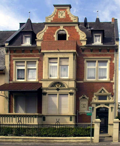 In der städtisch erscheinenden Häuserzeile wurde das Wohnhaus mit Laborräumen um 1900 für den Zahntechniker Gustav Klein (im Giebel GK) in aufwendigerem Historismus erbaut.