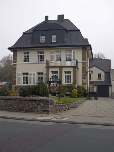 Die Ecken durch gequaderte Lisenen markiert, das Obergeschoss durch ein Sohlbankgesims gegürtet. An der Straßenfront asymmetrisch ein eingeschossiger Standerker mit Balkon, wieder mittig eine breite Dachgaube mit Segmentbogengiebel. Seitlicher Hauseingang mit vorgelagerter Treppe. Die meist modernisierten Fenster noch mit alten Läden ausgestattet; das verschieferte Mansarddach 1985 verändernd erneuert.