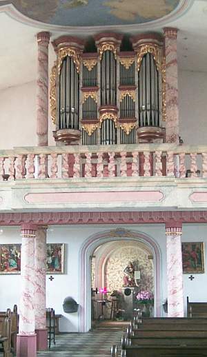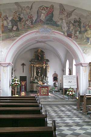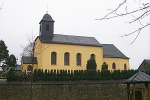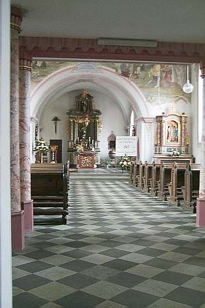 >> Die ursprüngliche Kirche wurde um 850 erbaut. Die katholische Pfarrkirche ist ein schönes Beispiel für den einfachen ländlichen Kirchenbau in der Barockzeit in der Eifel. Der einjochige Chor wurde 1750 fertiggestellt. Der Aufsatz des Hochaltars wurde um 1700 errichtet und von Ende des 18. Jahrhundert Stammen die beiden Seitenaltäre. Besonders auffallend sind die um 1920 entstandenen Wand- und Deckenmalereien, die sehr sehenswert sind. [3]